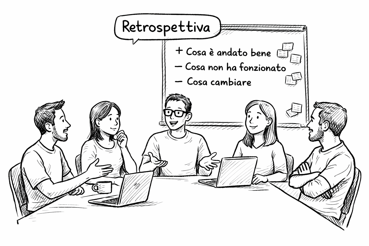 La retrospettiva è il momento dedicato al miglioramento continuo che si svolge al termine dello sprint e che coinvolge il team. Si riflette su come si è lavorato, non solo su cosa si è prodotto. Si individuano punti di forza, criticità e azioni concrete per rendere il prossimo sprint più efficace.