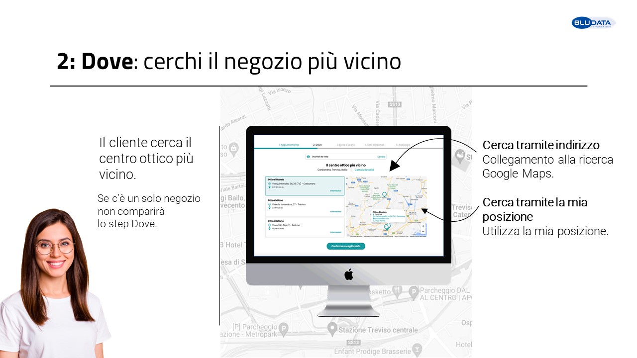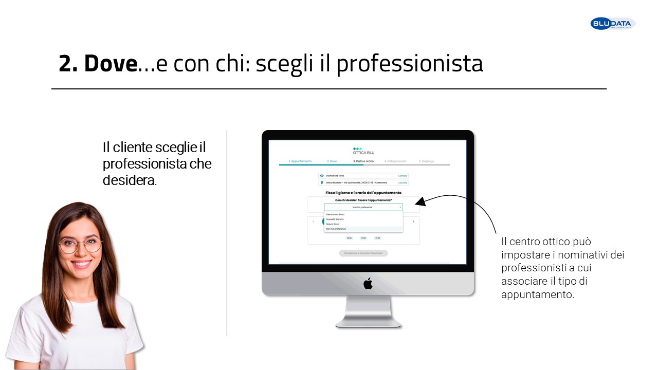 Blu Booking è stato ideato per venire incontro alle diverse esigenze dei centri ottici. Il form di prenotazione può essere visualizzato su una landing page, cioè una pagina internet creata da Bludata oppure può essere incorporato nel sito web.