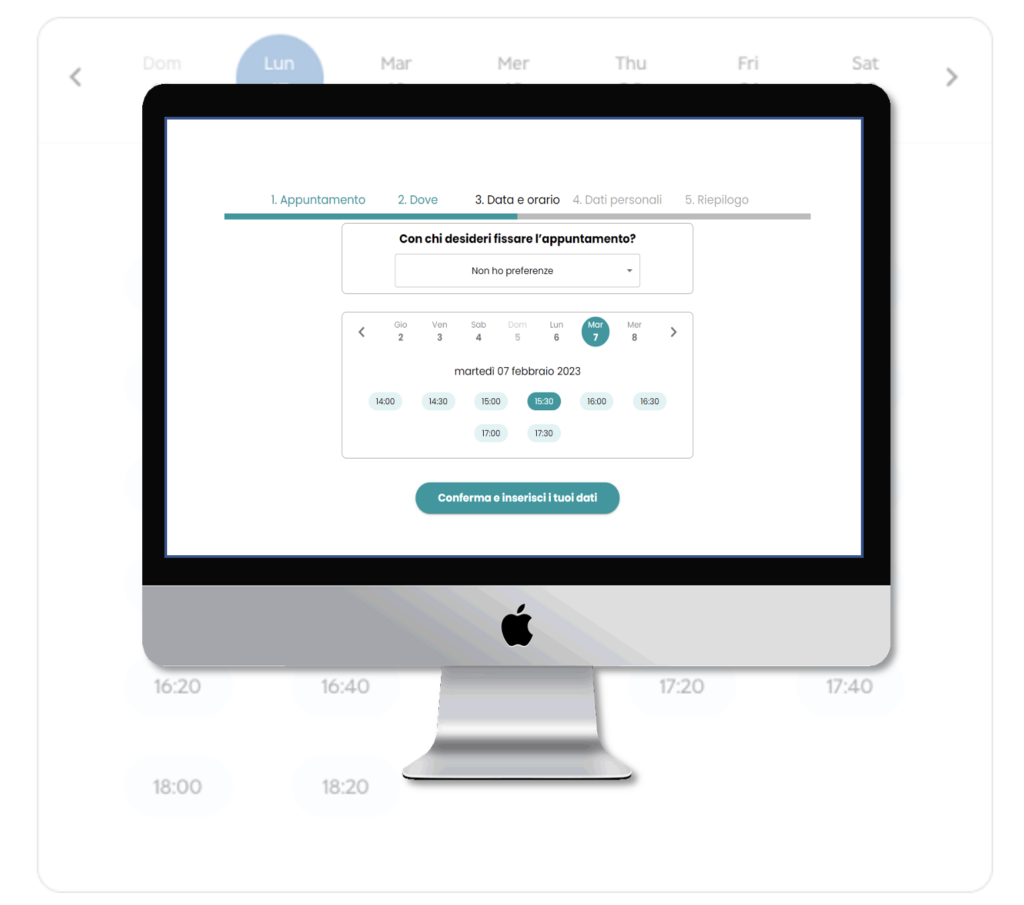 Il cliente prenota l’appuntamento in modo semplice seguendo un percorso guidato per fasi, partendo dal tipo di appuntamento di cui ha bisogno.